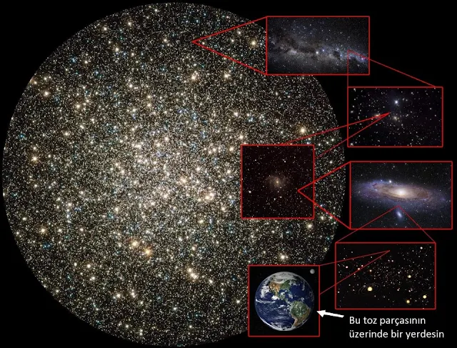 Aşağıdaki fotoğrafta Dünya'mızın evrendeki yerini göreceksiniz. Bu fotoğraf şüphesizki gerçek değil. Uzayın başlangıç ve bitiş noktaları da henüz bilinmiyor ancak yaşadığımız Dünya'nın evren içinde bir nokta kadar bile yer kaplamadığını gösteren bir fotoğraf. Ayrıca Dünya'daki bütün savaşların, kavgaların ve çekişmelerin ne kadar değersiz olduğunu gösteren bir fotoğraf. Hele ki evrende bu kadar keşfedilmeyi bekleyen gezegen ve gök cismi varken...